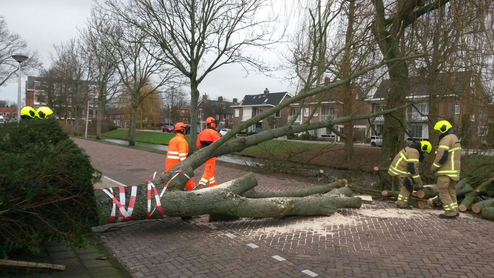 De weersvoorspellingen zijn niet mals voor deze 18de januari. Er is storm op komst en laat in de nacht is het hard gaan waaien. Al vroeg in de ochtend gaat de pieper voor een boom over de weg. We rukken uit en ter plaatse treffen we inderdaad een boompje over de weg aan. We zagen de boom in kleine stukken en leggen de stammetjes in de tuin van de eigenaar van de boom. Ik breng de man op de hoogte dat hij het hout zelf zal moeten afvoeren. Terug naar de kazerne en maar weer gaan proberen met werken. Helaas komt daar niet veel van want even later gaat opnieuw de pieper. We rukken uit voor een bouwsteiger die dreigt weg te waaien en dat kan gevaarlijke situaties opleveren. Als we ter plaatse komen treffen we een vreemde situatie aan. Vanaf een balkon van een pand wat wordt gerestaureerd is inderdaad een bouwsteiger weggewaaid en bovenin een flinke boom terecht gekomen. Het is een bijzonder gezicht en zeker ook geen stabiele situatie. Ik laat eerst de omgeving ruim afzetten voor het geval hij uit de boom komt vallen. Hier kunnen we met de autospuit niet zoveel beginnen want we hebben eigenlijk een kraan nodig om de steiger er veilig uit te halen. Ik laat een autoladder komen en we besluiten met de autoladder de steiger uit de boom te tillen. De wind trekt steeds harder aan en tijdens onze werkzaamheden zien we tot onze verbazing dat de complete dakbedekking van het pand door de wind wordt losgetrokken. Ook dit levert opnieuw gevaar op omdat het aan de andere kant van het pand naar beneden kan vallen. Het losgetrokken stuk dakbedekking waait heftig heen en weer en slaat één van de ramen van het pand kapot. De glasscherven vliegen ons om de oren. Ondertussen hoor ik dat de andere tankautospuit van ons korps naar een andere klus wordt gestuurd. Er dreigt een dakkapel weg te waaien dus ook daarvoor wordt onze hulp gevraagd. Wij zitten nog steeds met het stuk dakbedekking dat gevaarlijk heen en weer waait. De autoladder kan ook hier zijn dienst bewijzen. Met een reciprozaag wordt de dakbedekking losgezaagd en valt naar beneden, het gevaar is geweken. Nog tijdens het inpakken van deze klus worden we dringend verzocht door de meldkamer om richting de snelweg te gaan. Hier zou een grote tak of boom over de afrit liggen wat het verkeer belemmerd om door te rijden. Met enige spoed gaan we ter plaatse om ook dit probleem op te lossen. Op de afrit heeft de politie de veiligheid van ons al gewaarborgd waardoor snel en vakkundig de grote tak klein wordt gezaagd en aan de kant gelegd. Meerdere meldingen staan inmiddels in de wachtrij want we kunnen niet overal tegelijk zijn. De afrit is weer vrij en we vervolgen onze weg weer naar één van de straten van het dorp.