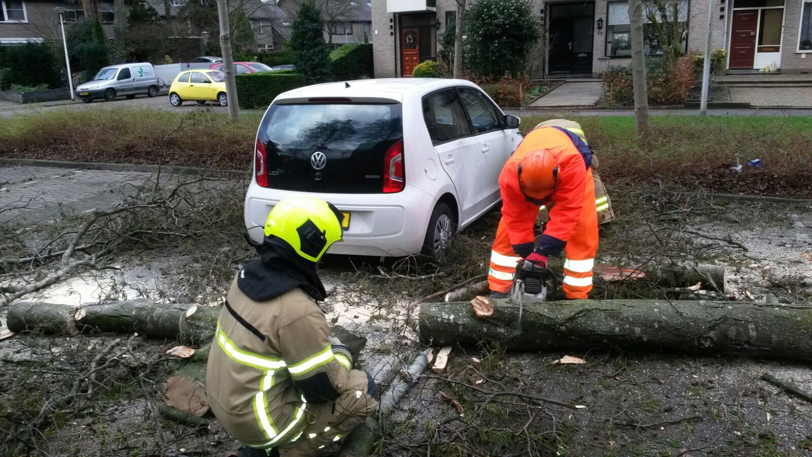 Helaas heeft ook hier de wind zijn werk gedaan en een grote boom geveld. De boom is terecht gekomen op een bestelbus en heeft flinke schade gemaakt. De zagers gaan weer aan de slag en even later is de bestelwagen en de weg weer vrij. Ik geef de locatie door aan de kazerne zodat al het hout door de gemeente kan worden weggehaald. Zo volgen er deze dag nog veel meldingen van omgevallen bomen en dakpannen die wegwaaien en gevaarlijk in de dakgoot blijven liggen. Tussendoor eten we met de ploeg op de kazerne en ontmoeten we de collega's die op andere plekken in ons dorp de andere klussen klaren. Na het eten er nog even op uit om de locatie te bezoeken die nog niet afgehandeld zijn. Op sommige plekken kunnen we nog wat doen en op andere plaatsen heeft een aannemer of hovenier het werk al opgeknapt. De wind is gaan liggen en wij zijn inmiddels ook zelf al aardig uitgeput. Terug op de kazerne hebben we met elkaar deze dag bijna 40 meldingen afgehandeld. Het maakt me trots om bij dit team te mogen horen.